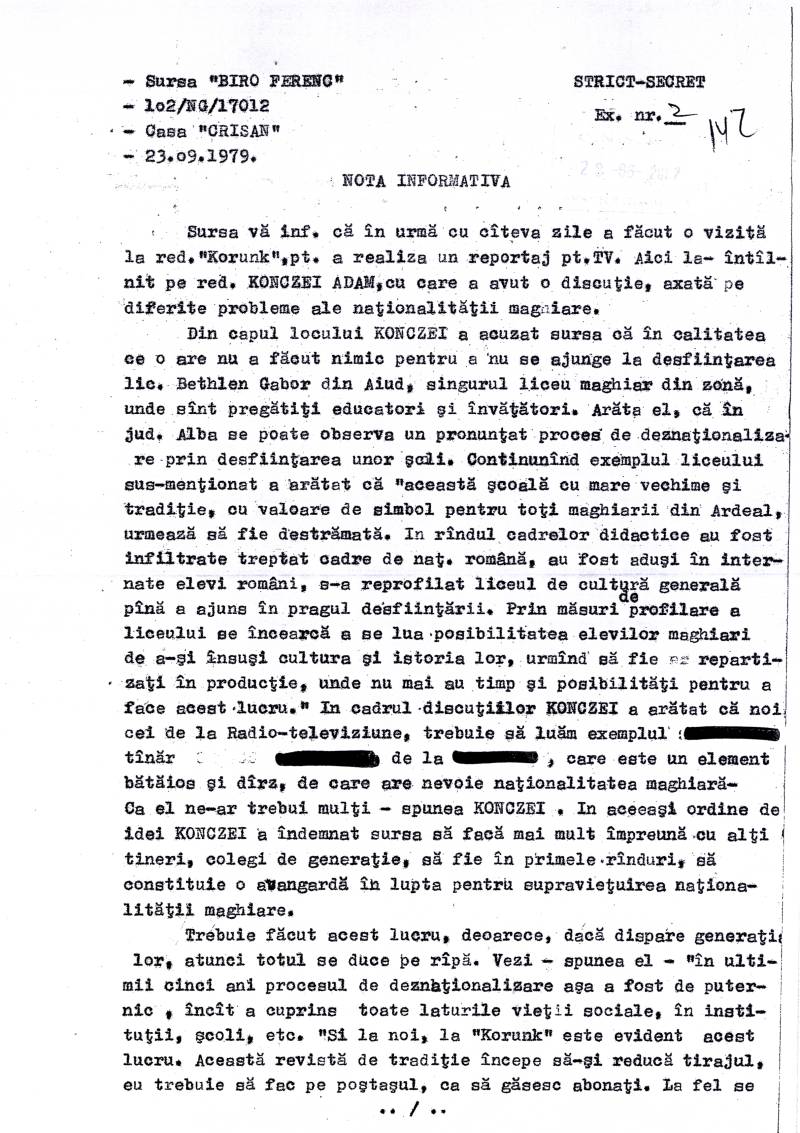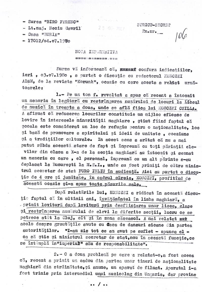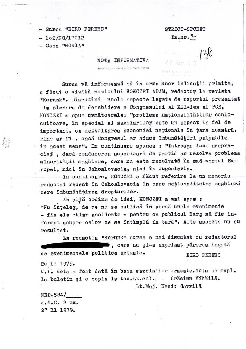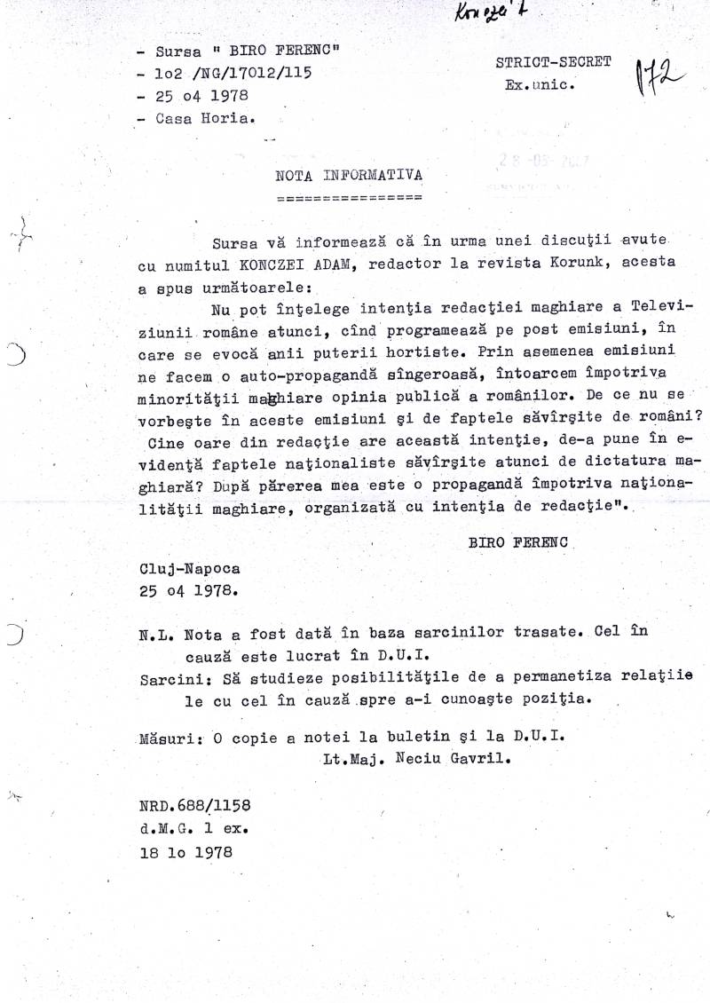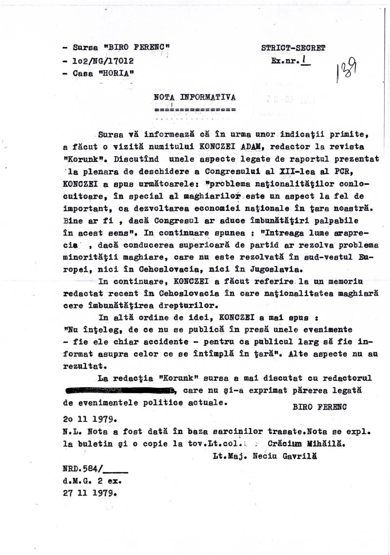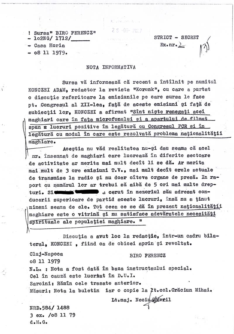 A forrás tudatja, hogy nemrégiben találkozott nevezett K.A-al, akivel elbeszélgetett azokról az adásokról, amelyeket a XII. Kongresszusra készített. Ezekről az adásokról és a benne szereplőkről KONCZEI azt az állítást tette, hogy “Azok a magyarok renegátok, akik a mikrofon és a filmezőgép előtt pozitív dolgokat mondanak az RKP Kongresszusáról és arról, hogy hogyan van megoldva a magyar nemzetiség kérdése. (Sursa vă informează că recent a întîlnit pe numitul KONCZEI ADAM … cu care a purtat o discuţie referitoare la emisiunile pe care sursa le face pt. Congresul al XII-lea, faţă de aceste emisiuni şi faţă de subiecţii lor, KONCZEI a afirmat “Sînt nişte renegaţi acei maghiari care în faţa microfonului şi a aparatului de filmat spun lucruri pozitive în legătură cu Congresul PCR şi în legătură cu modul în care este rezolvată problema naţionalităţii maghiare. 1979.11.08. 2873.135 old.)