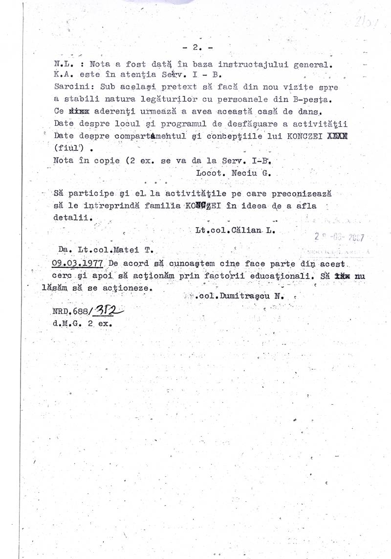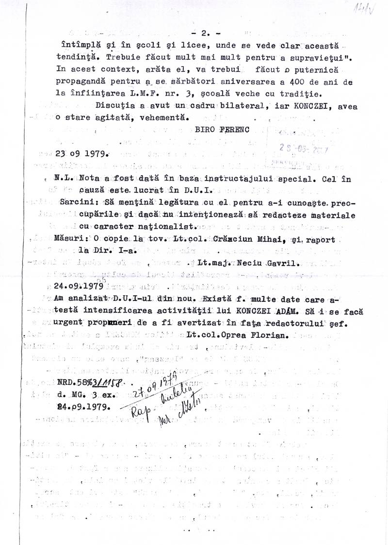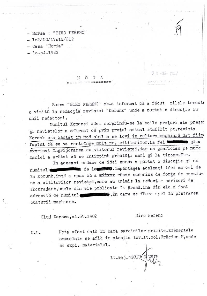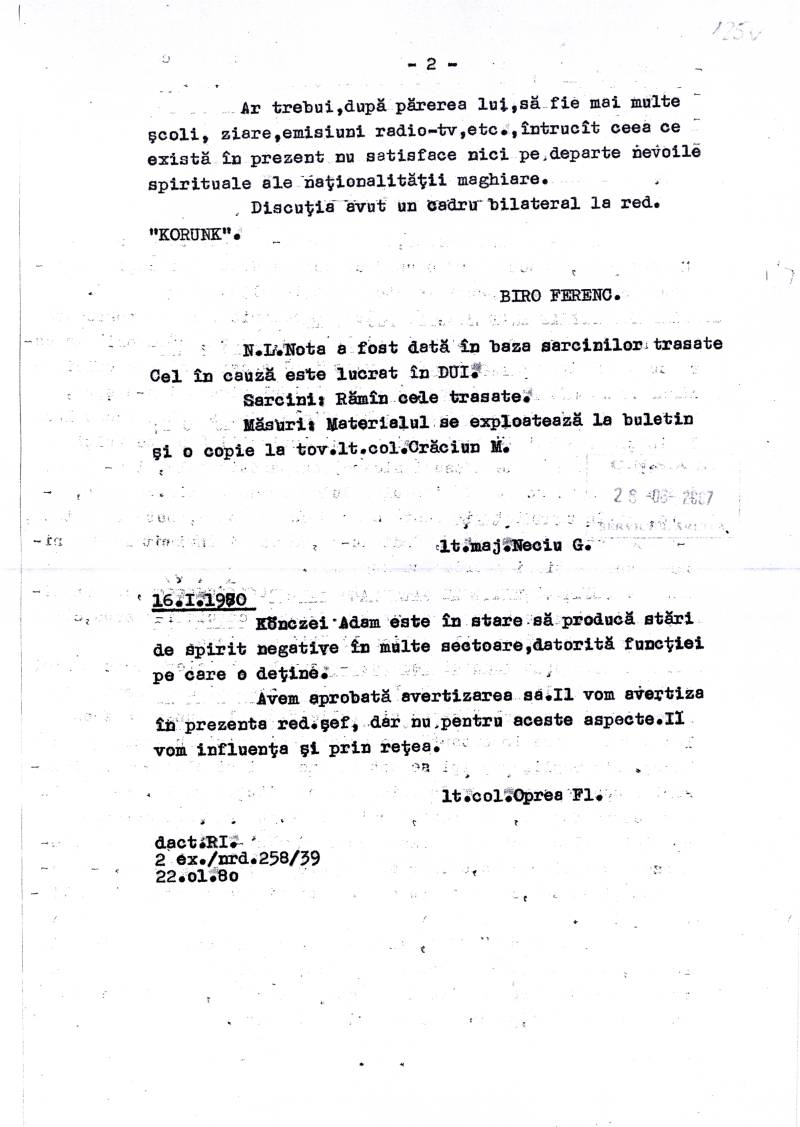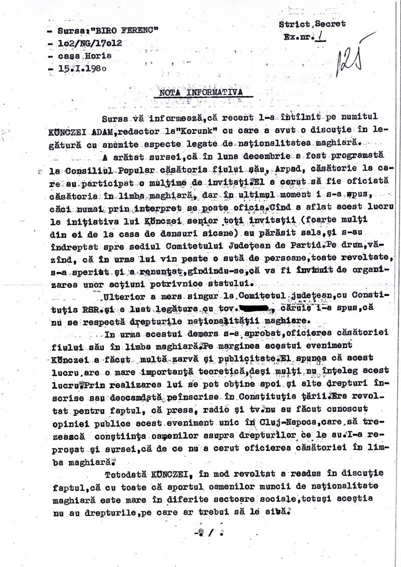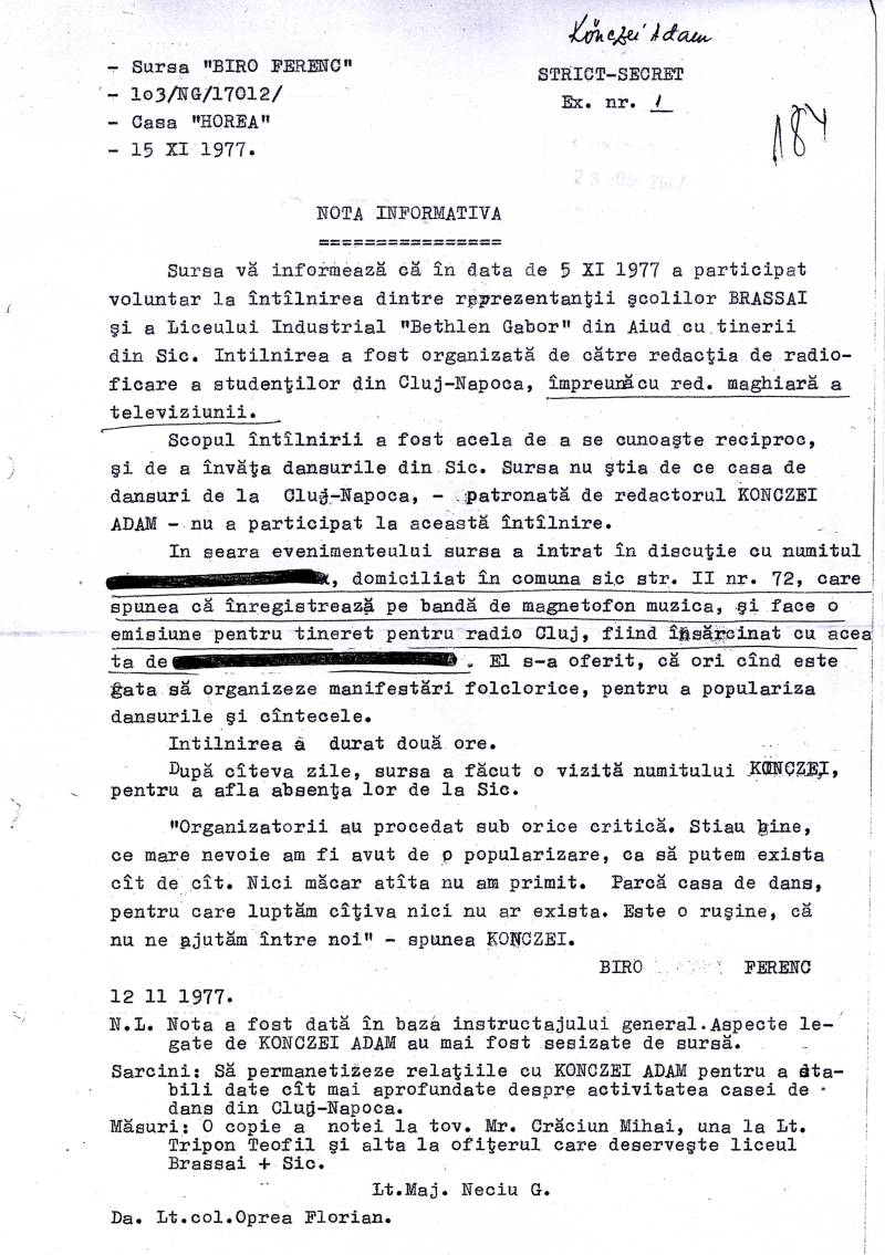 A forrás tudatja, hogy nemrégiben találkozott nevezett K.A-al, akivel elbeszélgetett azokról az adásokról, amelyeket a XII. Kongresszusra készített. Ezekről az adásokról és a benne szereplőkről KONCZEI azt az állítást tette, hogy “Azok a magyarok renegátok, akik a mikrofon és a filmezőgép előtt pozitív dolgokat mondanak az RKP Kongresszusáról és arról, hogy hogyan van megoldva a magyar nemzetiség kérdése. (Sursa vă informează că recent a întîlnit pe numitul KONCZEI ADAM … cu care a purtat o discuţie referitoare la emisiunile pe care sursa le face pt. Congresul al XII-lea, faţă de aceste emisiuni şi faţă de subiecţii lor, KONCZEI a afirmat “Sînt nişte renegaţi acei maghiari care în faţa microfonului şi a aparatului de filmat spun lucruri pozitive în legătură cu Congresul PCR şi în legătură cu modul în care este rezolvată problema naţionalităţii maghiare. 1979.11.08. 2873.135 old.)