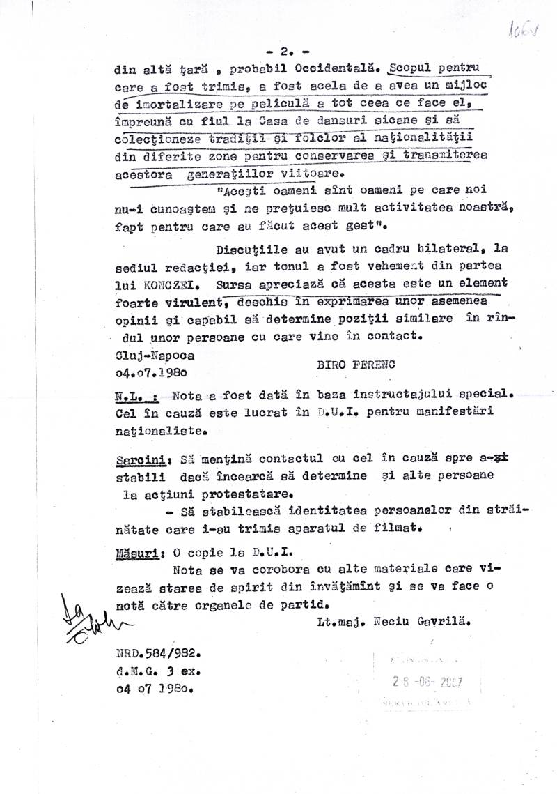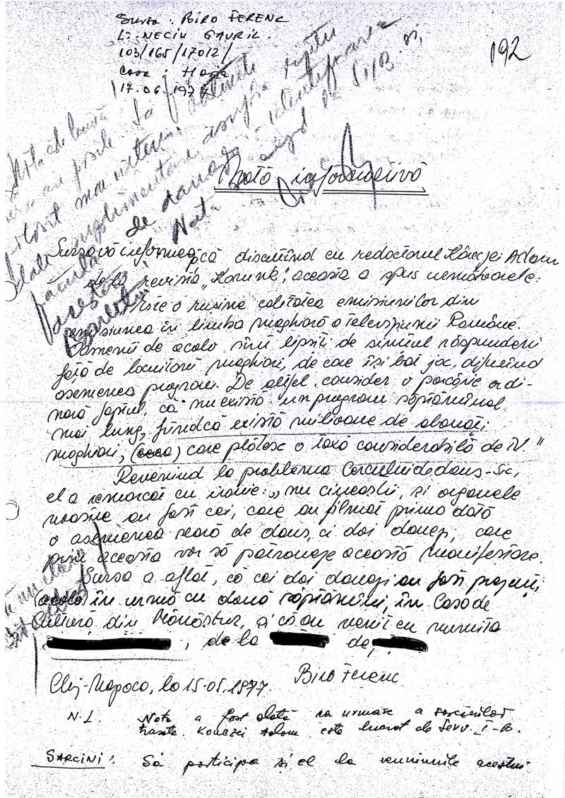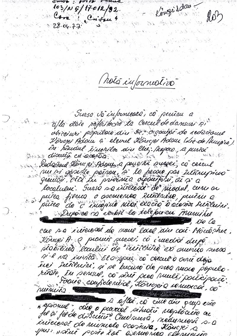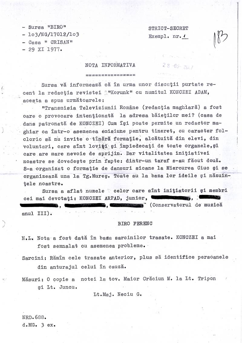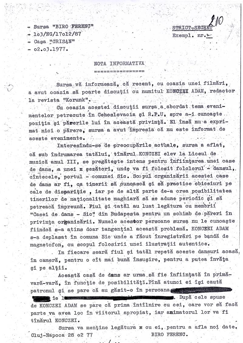 Mivel édesapám személyi megfigyelési dossziéjába (románul DUI) csak olyan dokumentumok kerültek be, amelyek valamilyen mértékben személyesen érintették, a „B. F” a rábízott feladatokról valószínűleg más aktákban heverő jelentésekben számol be. Egy 1979-ben szerkesztett „referátumban” egy szekustiszt mindenesetre már irredenta nótázásról beszél és külön mellékletre utal, amelyik a táncházba járók névsorát tartalmazza. A referátumot az informátorok beszámolói alapján készítették.