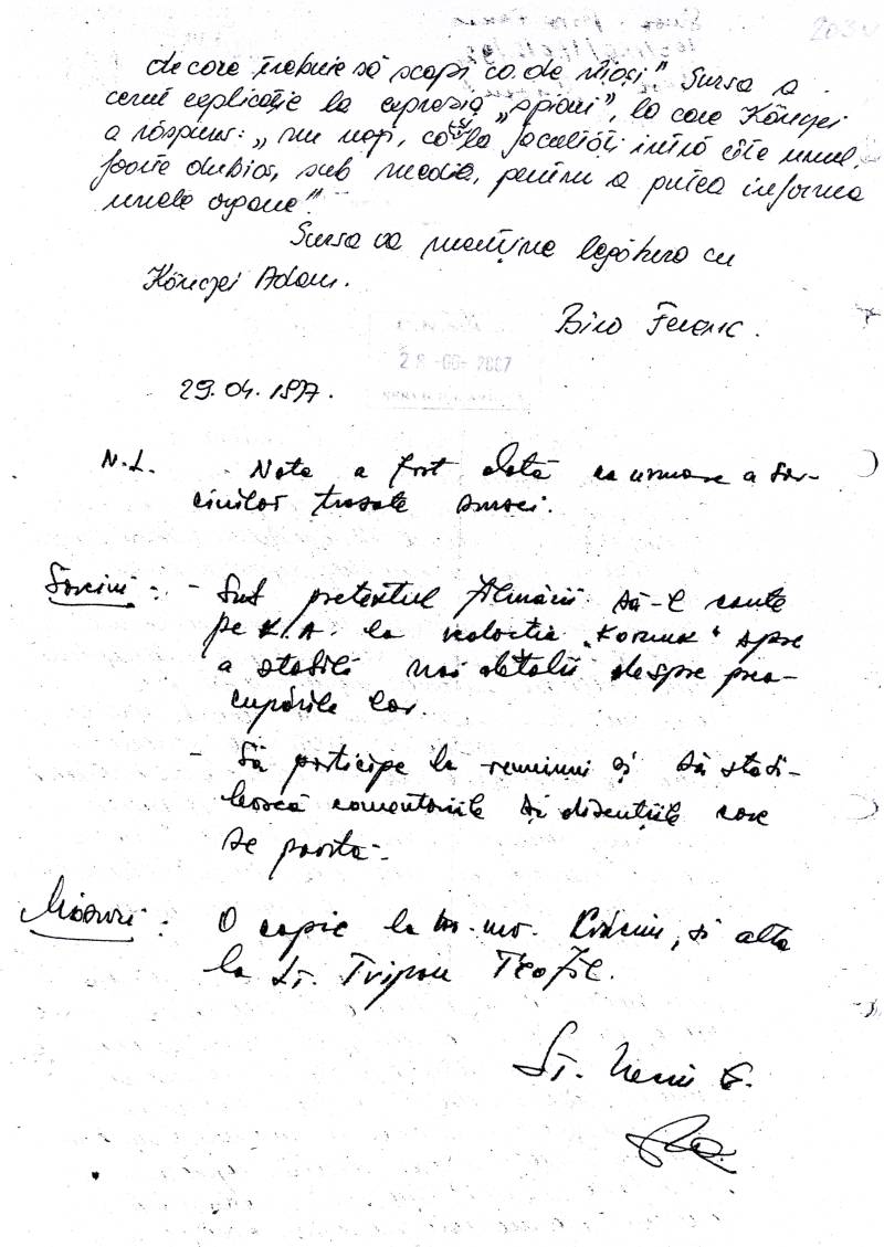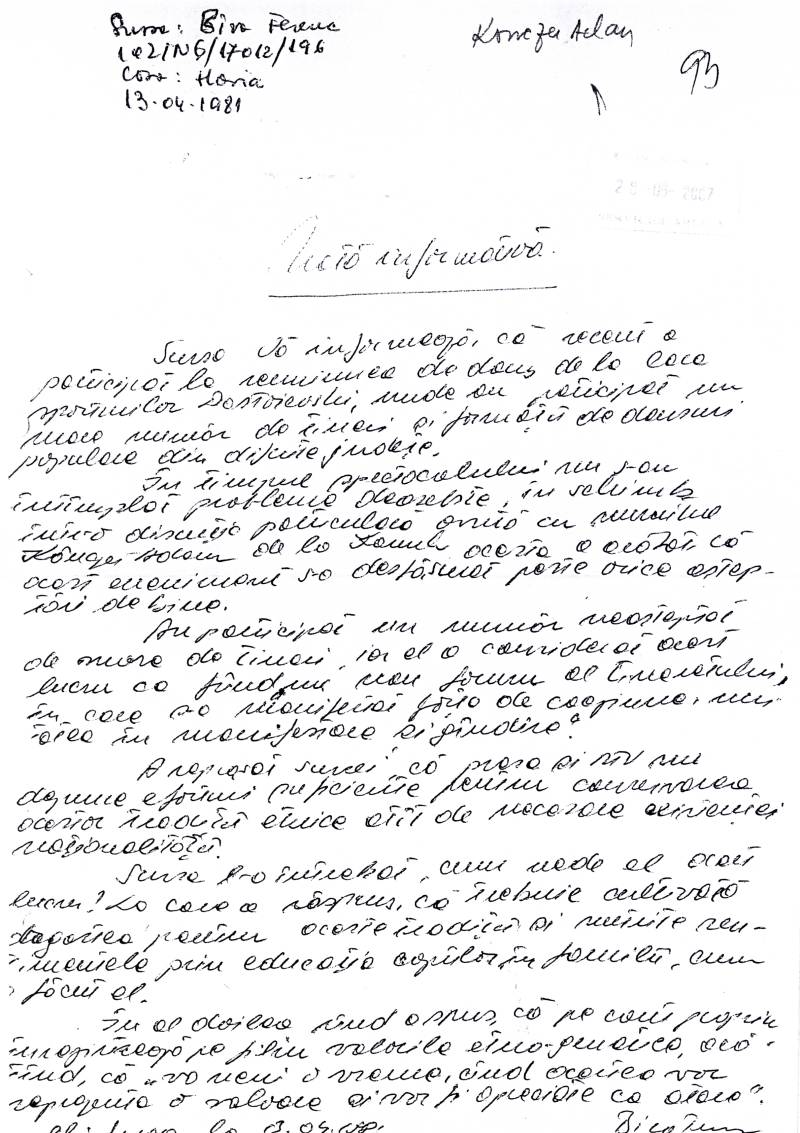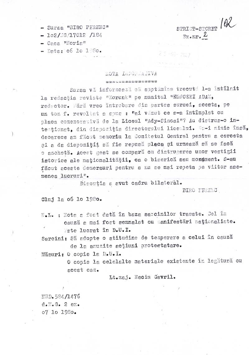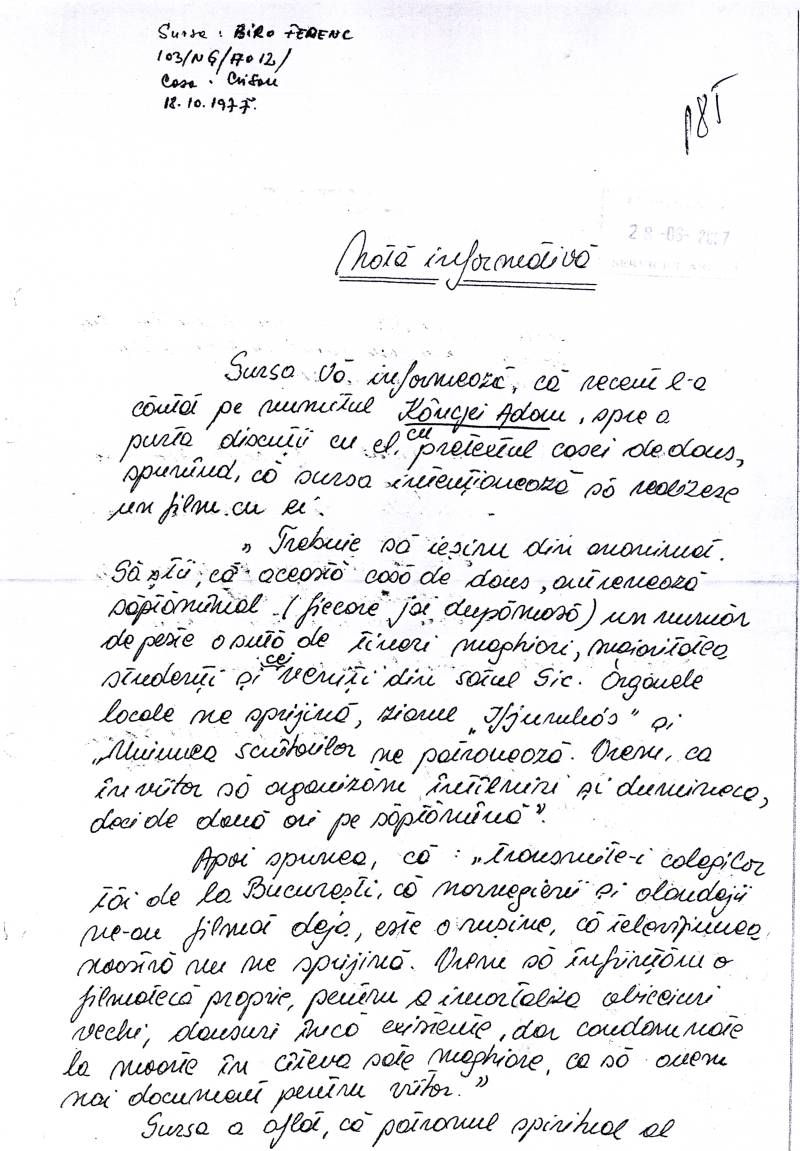 Mivel édesapám személyi megfigyelési dossziéjába (románul DUI) csak olyan dokumentumok kerültek be, amelyek valamilyen mértékben személyesen érintették, a „B. F” a rábízott feladatokról valószínűleg más aktákban heverő jelentésekben számol be. Egy 1979-ben szerkesztett „referátumban” egy szekustiszt mindenesetre már irredenta nótázásról beszél és külön mellékletre utal, amelyik a táncházba járók névsorát tartalmazza. A referátumot az informátorok beszámolói alapján készítették.