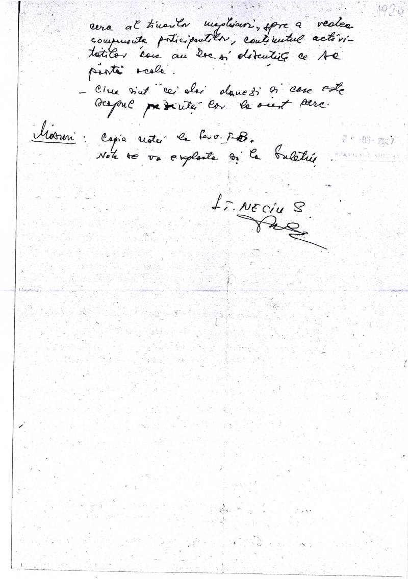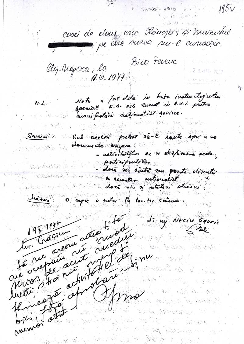 Ki kell lépnünk az anonimitásból. Tudd meg, hogy ez a táncház hetente (minden csütörtökön délután) több mint száz magyar fiatalt foglalkoztat, többségükben diákokat és székieket. A helyi hatóságok támogatnak, az “Ifjumunkás” és az “Írók Szövetsége” patronál. A jövőben szeretnénk vasárnap is megszervezni, kétszer egy héten. (“Trebuie să ieşim din an anonimat. Să şti, că această casă de dans, antrenează săptămînal (fiecare joi dupămasă) un număr de peste o sută de tineri maghiari, maioritatea studenţi şi cei veniţi din satul Sic. Organele locale ne sprijină, ziarul “Ifjumunkas” şi “Uniunea scriitorilor” ne patronează. Vrem, ca în viitor să organizăm întîlniri şi dumineca, deci de două ori pe săptămînă.” – 1977.10.18. 2873. 185. old.)