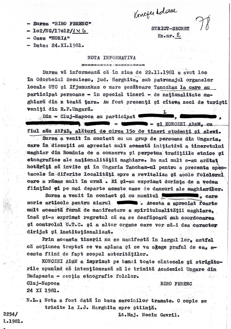 A forrás tudatja, hogy 1981.11.22-én Székelyudvarhelyen, Hargita megyében, a helyi KISZ szervek és az Ifjúmunkás patronátusa alatt egy nagy Tánczház kaláka volt, amin az egész országból magyar nemzetiségű fiatalok – nagyrészt fiatalok – vettel részt- Néhány tíz magyarországi turista is jelen volt. (Sursa vă informează că în ziua de 22.11.1981 a avut loc în Odorheiu Secuiesc, jud. Harghita, sub patronajul organelor locale UTC şi Ifjumunkas o mare şezătoare Tanczhaz la care au participat persoane – în special tineri – de naţionalitate maghiară din toată ţara. Au fost prezenţi şi cîteva zeci de turişti veniţi din R.P.Ungară. 1981.11.24. 2873. 78. old.)