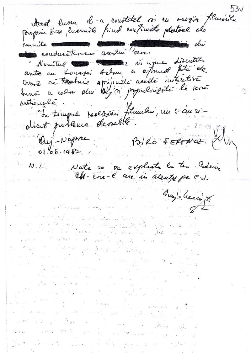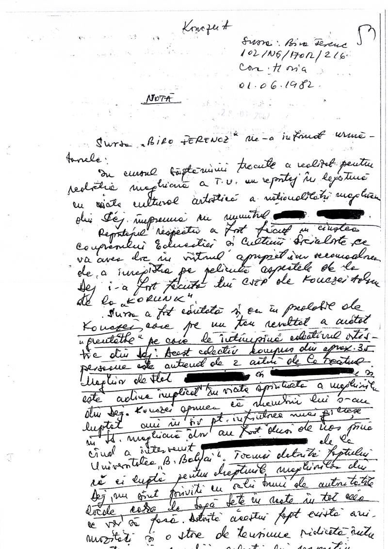 A múlt héten a TV magyar adása számára egy riportot készített a dési magyar nemzetiség kulturális-művészeti életéről nevezett ______vel. A riportot a Szocialista Nevelés és Kultúra Kongresszusának a tiszteletére készítették, amelyikre rövidesen sor fog kerülni, az ajánlást pedig, hogy a dési helyzetet filmre vegyék, K.A. tette a Korunktól, CSEP-nek. (În cursul săptămînii trecute a realizat pentru redacţia maghiară a TV un reportaj în legătură cu viaţa cultural artistică a naţionalităţii maghiare din Dej împreună cu numitul _______ Reportajul respectiv a fost făcut în cinstea Congresului Educaţiei şi Culturii Socialiste ce va avea loc în viitorul apropiat iar recomandarea de a înregistra pe peliculă aspectele de la Dej i-a fost făcută lui CSEP de Konczei Adam de la „KORUNK”. 1982.06.01., 2873. 53 old.)