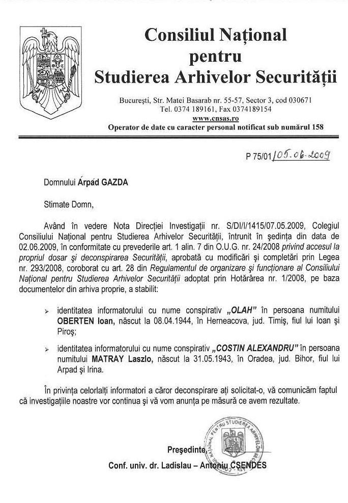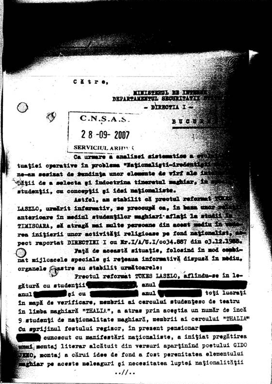 (“Trecîndu-se la documentare au fost audiate în calitate de martori trei persoane din a căror declarații rezultă unele atitudini naționaliste manifestate de KONCZEI ADAM pînă în luna iunie 1965, pînă cînd a lucrat la Întreprinderea poligrafică Cluj.”)