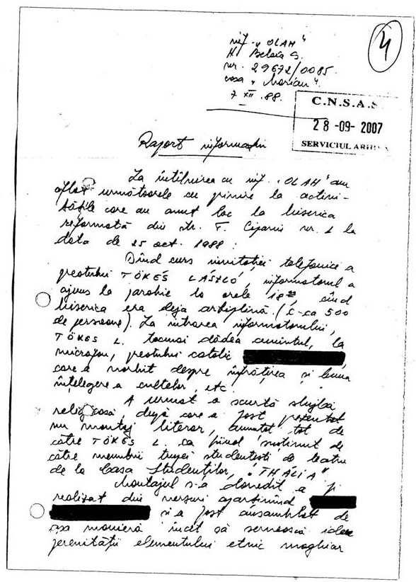 Augusztus 23-án KONCZEI ADAM, nyomdai korrektor, felkereste otthonában a forrást azzal a kéréssel, hogy találjak számára egy megoldást arra, hogy áthelyezzék valahova, ahol a mesterségében tud dolgozni, pontosabban, ahol a folklórismereteit gyümölcsöztetheti. Azt mondta, hogy a probléma sürgős volna, mivel hétfőn elhagyja a munkahelyét. Mondtam neki, hogy mivel családja van (felesége és gyermeke), és csak ő keres, jó volna, ha nem menne el, mielőtt biztosítva lenne az egzisztenciája. Kérdőre vontam, mi ez a sietség? Mire ő elmondta, hogy bizonyos sport-plakátok korrektúrájakor, a megrendeléssel együtt leadott kézirattól eltérően, megváltoztatta egyes magyar sportolóink nevét, pl. a Vamoși neve helyett azt írta, Vámoși, viszont Iolanda Balaș nevét úgy hagyta, mivel ez a sportolónő így nevezte magát egy budapesti versenyen, úgyhogy ez az ő ügye. A többinek a nevét azonban a saját sajtónk is úgy használja, ahogyan ő kijavította.