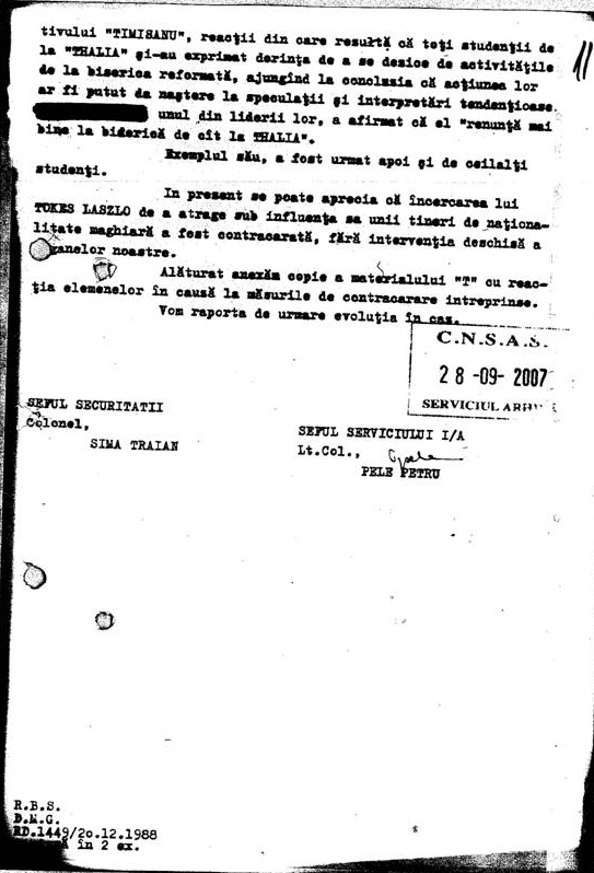 N.B. KONCZEI ADAM ne-a mai fost semnalat de agentura cu manifestari nationaliste. De altfel pentru asemenea manifestari a fost inlaturat de la universitate in 1956 [sic!]. De asemenea ne-a mai fost semnalat că aduce transformări textelor in defavoarea noastra [sic!]. Deci el prin aceasta desfasoara activitate nationalista maghiara.